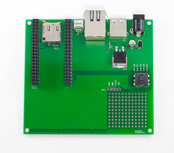 This is a dev board for the mbed module. It has a two row socket for the mbed and can be use with jumper wires. With an on board 5v regulator it can powered by external DC supply without the need of the mbed USB connection.