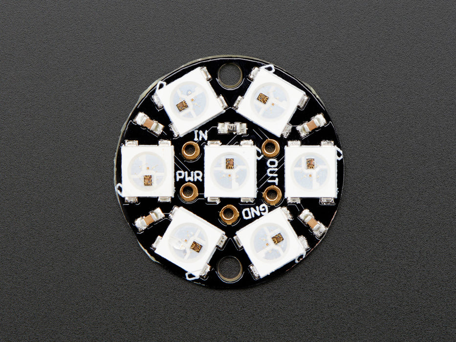 Comes as a single round board with 7 individually addressable RGB LEDs assembled and tested.