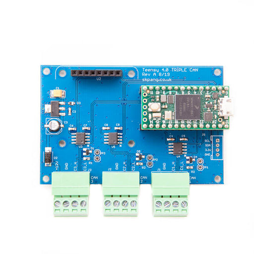 This is a Teensy 4.0 board with triple CAN connections. Two CAN 2.0B and one CAN FD. It can be powered by an external +12v DC with reverse volt...