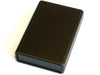 Two part black plastic enclosure with front and back panel. Length = 110mm (4.3"), width = 75mm (2.9"), height = 25mm (1.0"). Includes enclosure, flat plastic front and back panels, raised plastic front and back panel, and fastening screws.
